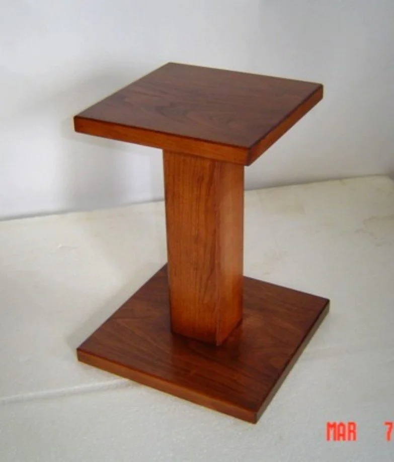 Square top and bottom at 1" thick; Middle post is 4" x 4"; 24” tall